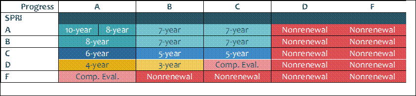 Schools receive an SPRI equivalent to a letter grade of “A” and do not qualify for the 10-year renewal AND have an “A” for Progress OR