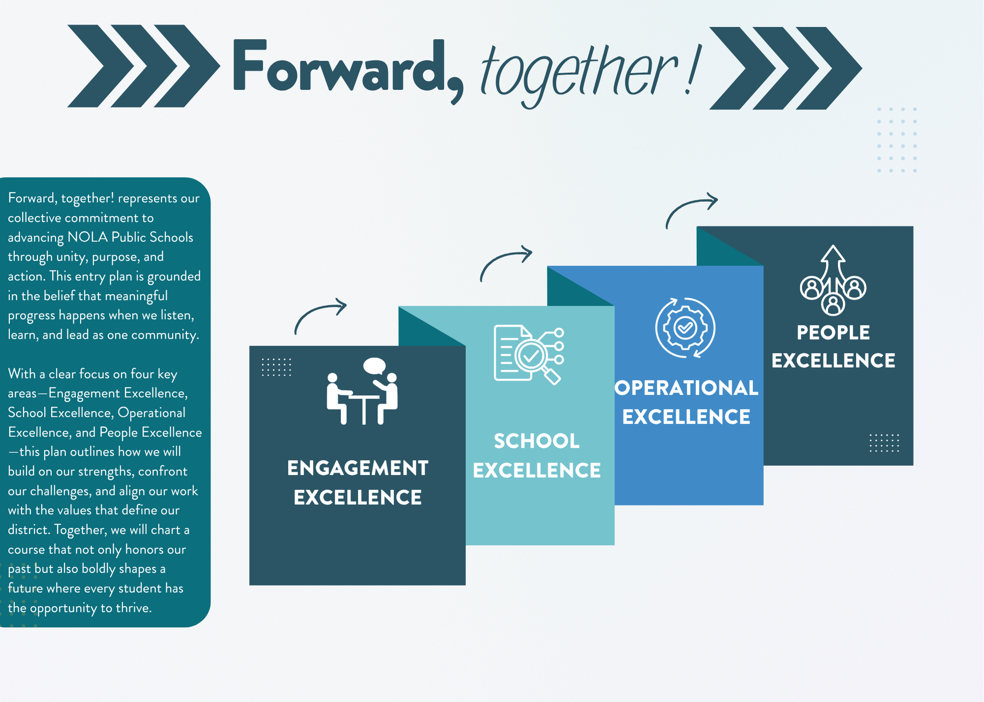 This plan is designed to ensure our district remains focused on what matters most—our students. With the support of the Orleans Parish School Board, our dedicated staff, school leaders, families, and community partners, we will shape a brighter future for every child. I’m excited about the journey ahead. Forward, together!