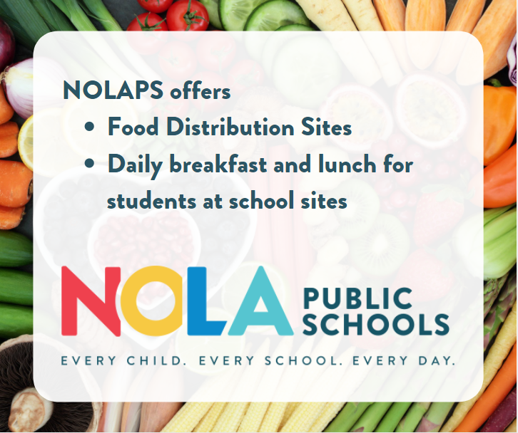 Every day, millions of people are faced with the uncertainty of when they will eat their next meal. Food insecurity occurs when nutritional intake or eating patterns are disrupted due to limited resources or a lack of access to food. Various life factors can put families at risk of food insecurity, such as loss of employment, lack of transportation, limited local access to food, changes in a caregiver's psychological well-being, or the presence of a disability. Due to measures put in place to contain and stop the spread of COVID-19, many families were and are impacted financially. Food insecurity, including temporary exposure to food insecurity, during pediatric development is likely to have a negative impact on the physical, emotional, and cognitive development of a child. In addition to these outcomes, food insecurity has the strong potential to present as a form of trauma in a child's life. Childhood stressors can be cumulative and chronic, and many consequences of food insecurity have implications for individuals beyond childhood and across their life-span development. Students who attend school daily receive breakfast and lunch and some schools have local partnerships for expanded access to food beyond the school day. Second Harvest Food Bank Second Harvest Food Bank leads the fight against hunger in South Louisiana by providing food access, advocacy, education, and disaster response. Second Harvest provides food and support to 700+ community partners and programs across 23 parishes. Our staff and volunteers distribute the equivalent of more than 32 million meals to 210,000+ people a year. You can find more information about Second Harvest’s current services on their website, Facebook, Twitter, and Instagram. The Get Help page outlines their opportunities for food access each week including Community Pantry-Partners, Food Distribution Sites, and an Emergency Pantry. You can also access the Public Assistance Helpline at 1-855-392-9338 or email help@secondharvest.org. Total Community Action TCA’s mission is to reduce poverty in our community through collaboration with other agencies by providing human services, experiences, and opportunities that move persons from poverty to self-sufficiency. You can find more information about Total Community Action’s current services on their website, Facebook, and Twitter. The TCA Community Services page outlines their current services including an Emergency Food Pantry and Commodity Distribution Program. You can reach them by phone (504) 872-0334 or in person at their office, located at 1410 South Norman C. Francis Pkwy, New Orleans, LA 70125. NOLA Public Schools As a part of our response to the COVID-19 pandemic, New Orleans Public Schools created a Community Feeding Program to ensure families have access to food regardless of if students are reporting to school for in-person learning or doing distance learning. 20 locations serve meals free of charge to children under the age of 18, regardless of what school they are enrolled in. Please note that distribution times vary. You can see an interactive map of the sites on the Covid-19 Updates page of our website.