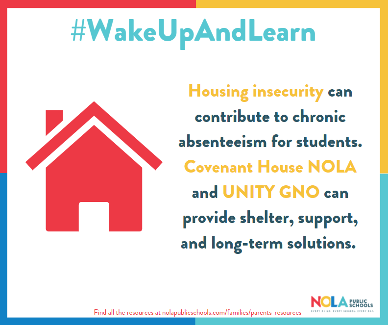 Students experiencing homelessness are chronically absent from school at a rate at least twice that of the overall student population, and significantly more often than their housed, low-income peers. The mobility, poverty, and trauma associated with homelessness affects students’ emotional and physical health, hygiene, preparedness for school, transportation options, and other factors that increase absenteeism. Chronic absences increase the likelihood that a student will drop out of high school, which increases the likelihood they experience homelessness as young adults. Not completing high school is the greatest single risk factor for young adult homelessness. To support youth and families in accessing housing support highlighted here are a few community resource providers: Covenant House and UNITY of Greater New Orleans Covenant House (CHNOLA) is much more than “just a shelter,” and provides supportive counseling and the tools needed to help youth become independent, productive members of our community. CHNOLA’s offers programming and services in Crisis Care & Stable Housing; Education, Employment, and Life Skills; Health and Wellness; and Outreach. Covenant House Information can be found on their Website, Facebook, Twitter, and Instagram UNITY of Greater New Orleans is a nonprofit organization leading a collaborative of over 60 agencies providing housing and services to people who are homeless or at risk of homelessness in Orleans and Jefferson parishes. Our mission is to coordinate community partnerships to prevent, reduce, and end homelessness. UNITY’s programs include: UNITY of Greater New Orleans Information can be found on their Website, Facebook, and Twitter.