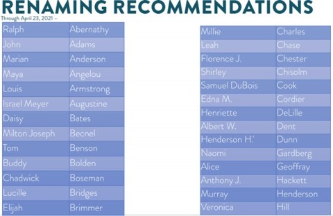 (New Orleans – June 8, 2021) – Today, NOLA Public Schools (NOLA-PS) Superintendent Dr. Henderson Lewis, Jr. presented his list of recommendations for the renaming of several public school buildings to the Orleans Parish School Board's (OPSB) Committee of the Whole for consideration. The committee unanimously voted to accept the list and placed it o...