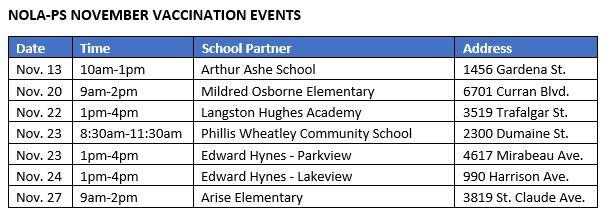 Starting this Saturday, Nov. 13 at 10AM, the District will host its first vaccination event for NOLA-PS families designed to help protect our youngest learners from the coronavirus. Future events are planned for every Saturday in November and during Thanksgiving Week in partnership with our school communities. The schedule and registration information can be found below or at nolapublicschools.com/vaccinations.