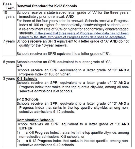 Consistent with the philosophy of rewarding strong performance and providing incentives for schools to strive for continual improvement, the renewal terms for OPSB-authorized charter schools shall be linked to each school's performance on the OPSB renewal standards in accordance with the following table: