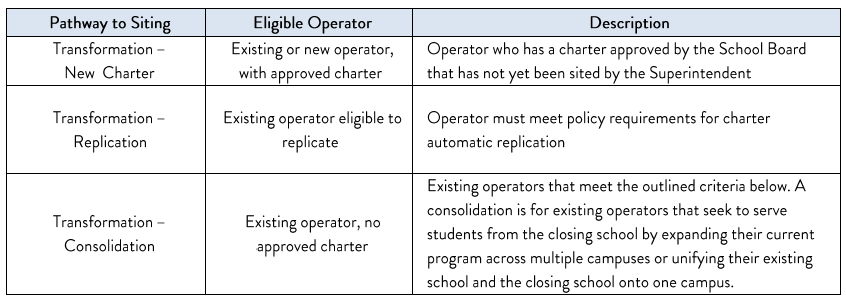 New and existing eligible operators are welcome to participate in the open siting process. In all pathways to siting below, current scholars will retain a seat at the new school.