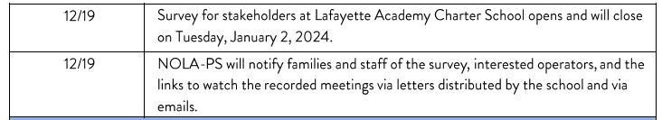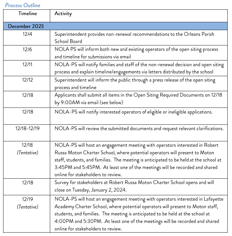 (New Orleans – December 13, 2023) — NOLA Public Schools (NOLA-PS) is engaging in the district's open siting process to provide for the sustained operation of Lafayette Academy Charter School and Robert Russa Moton Charter School for the 2024-2025 school year. This proactive measure follows the Orleans Parish School Board's (OPSB) recent approval of Superintendent Dr. Avis Williams' recommendation to not extend Lafayette Academy's contract and accept Advocates for Innovative Schools' voluntary withdrawal to seek renewal of Moton's contract.
