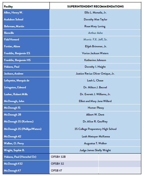 The renaming process was guided by a Renaming Committee. In accordance with OPSB policy, this committee consisted of a school board member appointed by the OPSB president; a representative of the NOLA-PS administration; and community members approved by the superintendent.